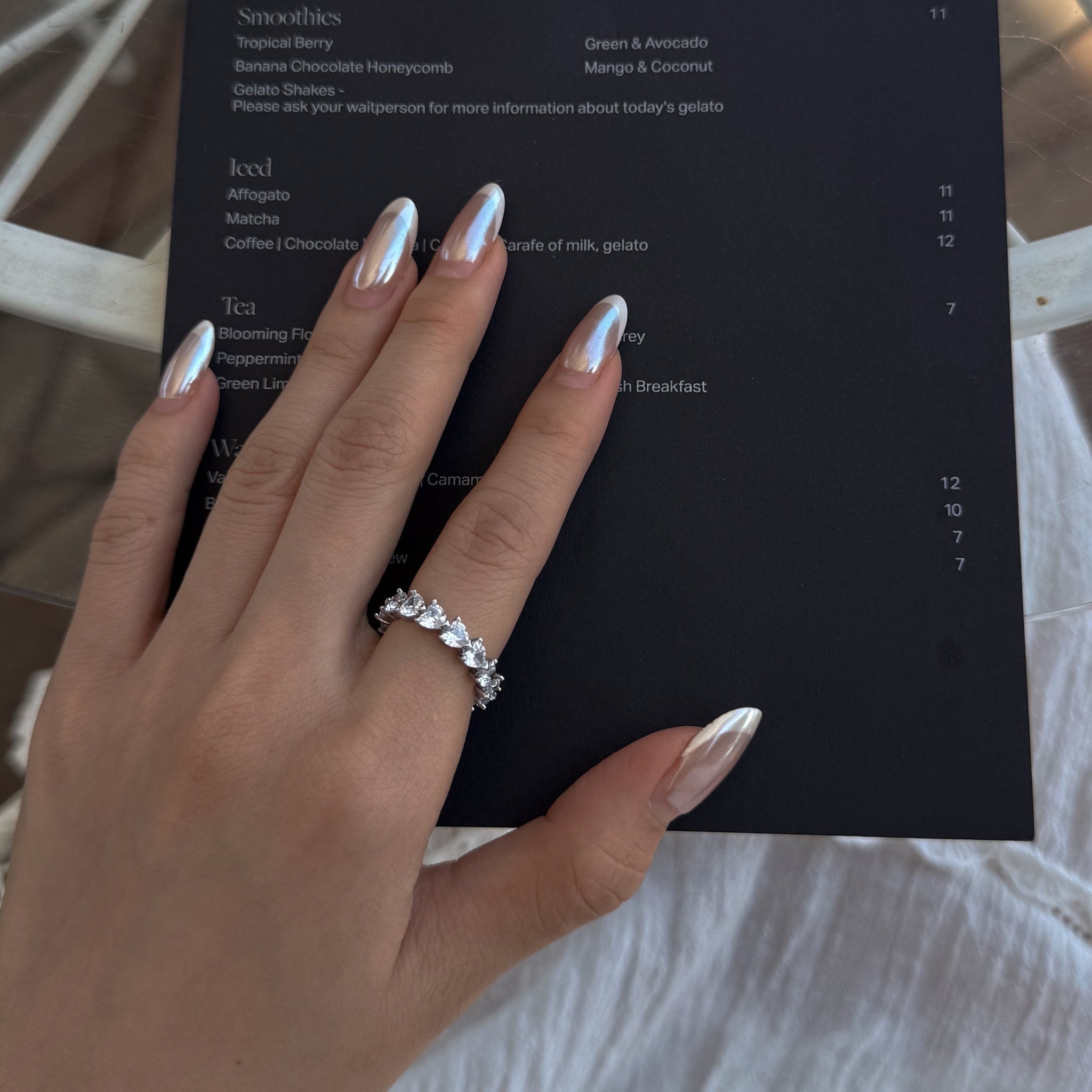 Hand with lume jewellery's amore ring on a white bag